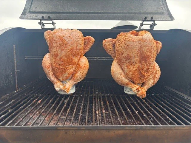 Blend all dry rub ingredients and rub into chicken. Crack open the beer can and drink down or pour away about half. Carefully place chicken atop the can. The can should fit nicely into the cavity of the chicken, standing securely. Place on rack in smoker and smoke for about an hour and a half, checking hopper occasionally to make sure pellet supply is good. Then place the chicken in a 350 degree oven, and allow it to finish cooking until it tests at least 165 degrees,* basting a couple times with melted butter. Allow to rest for at least 30 minutes, but the longer, the better with smoked meats. Pull chicken off of the beer can carefully; depending on how long the chicken has rested, it will still be very hot.