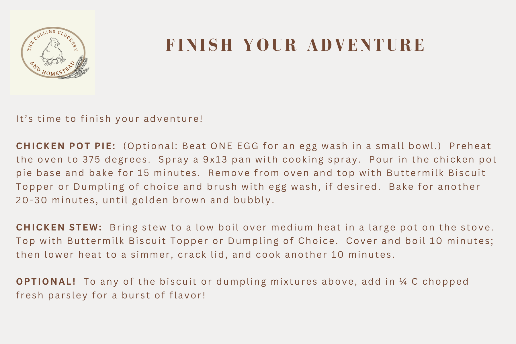 So grab a Collins Cluckery Chicken HERE and choose your adventure!